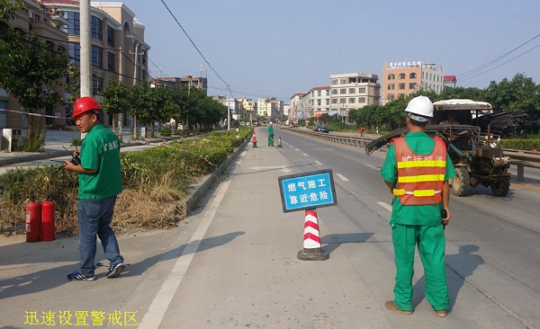 本次演練項(xiàng)目為:天然氣管道被第三方施工單位挖破后大量泄漏的應(yīng)急處置。主要流程為:模擬事故發(fā)生、報警、應(yīng)急啟動、人員疏散、安全警戒及交通管制、關(guān)閉上下游管道閥門、驅(qū)散泄漏燃?xì)狻⑵茡p管道搶修、解除警戒、恢復(fù)供氣等。在演練過程中,所有參演人員嚴(yán)肅認(rèn)真、節(jié)奏緊湊而又有條不紊地進(jìn)行各個演練步驟,歷時近50分鐘后,演練圓滿完成。