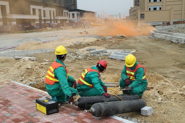 當(dāng)天上午9:30,管網(wǎng)部2652111值班搶險(xiǎn)電話驟響:“位于萬(wàn)科小區(qū)附近,燃?xì)夤艿涝谑┕み^(guò)程中不慎挖破,造成燃?xì)庑孤┲穑?qǐng)盡快搶修處理”。值班人員隨后立即向119報(bào)警并上報(bào)運(yùn)行中心總監(jiān)黃劍鋒,黃總監(jiān)接到通報(bào)后立即啟動(dòng)公司突發(fā)事故應(yīng)急預(yù)案,并向曠遠(yuǎn)能源總經(jīng)理姜升科匯報(bào)事故發(fā)生情況。事故發(fā)生15分鐘后,各應(yīng)急處理小組奔赴現(xiàn)場(chǎng),各就各位:泄漏源控制小組立即疏散現(xiàn)場(chǎng)人員、設(shè)立警戒,緩緩關(guān)閉上下游閥門(mén)并通入氮?dú)膺M(jìn)行置換;消防小組配合消防利用水槍進(jìn)行管道降溫和燃?xì)怛?qū)散;搶修組人員在確認(rèn)燃?xì)鉂舛冉档偷桨踩孪藓罅⒓磳?duì)燃?xì)夤苓M(jìn)行修復(fù),并在冷卻后進(jìn)行試壓檢查;控制小組使用檢測(cè)儀對(duì)著火點(diǎn)附近進(jìn)行濃度檢測(cè),確保周邊環(huán)境安全后恢復(fù)正常供氣。