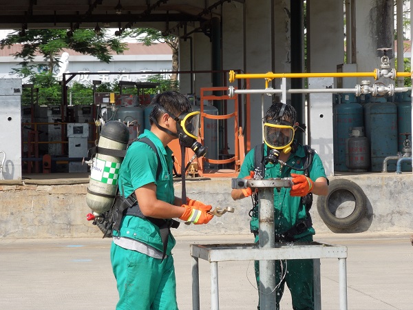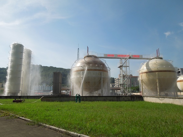 本次演練項目為:LPG1#儲罐底部出口閥被恐怖分子破壞造成液化石油氣泄漏事故的應(yīng)急處置。主要流程為:模擬事故發(fā)生、制服歹徒、報警、應(yīng)急啟動、人員疏散、安全警戒、消防噴淋驅(qū)散稀釋燃?xì)鉂舛?、搶險堵漏及最終解除警戒等。在總指揮的領(lǐng)導(dǎo)下,所有參演人員嚴(yán)肅認(rèn)真、有條不紊地進行各個演練步驟,歷時一個小時后,演練圓滿結(jié)束。